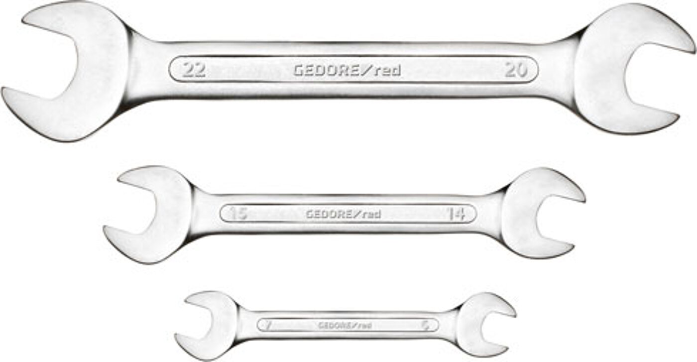 Aus Chrom-Vanadium-Stahl, verchromt. 8-teilig, mit Schlüsselweiten: 6x7, 8x9, 10x11, 12x13, 14x15, 16x17, 18x19, 20x22 mm. 12-teilig, mit Schlüsselweiten: 6x7, 8x9, 10x11, 12x13, 14x15, 16x17, 18x19, 20x22, 21x23, 24x27, 25x28, 30x32 mm.